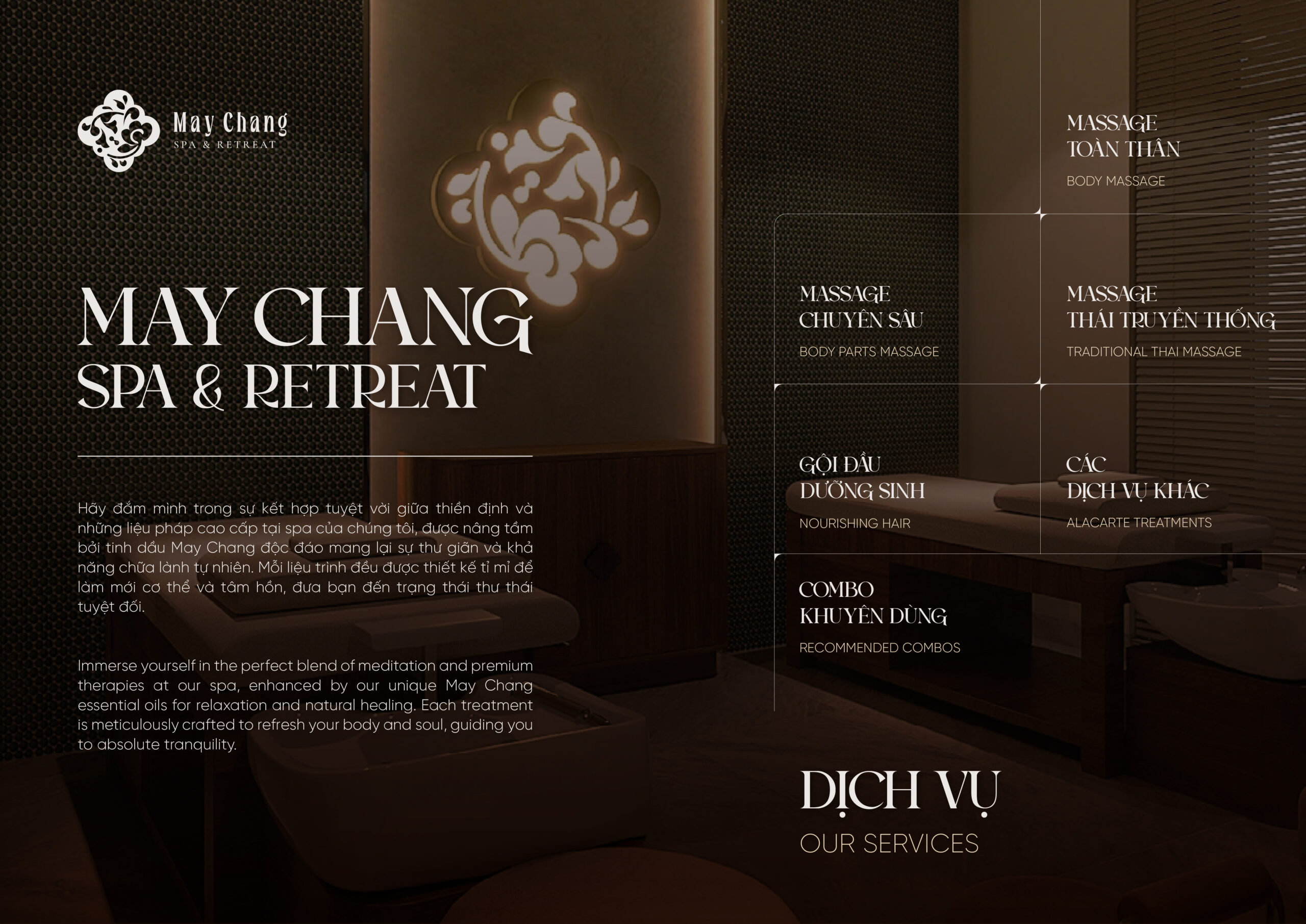 Lấy cảm hứng từ cây Màng Tang – loài thảo dược giản dị mang sức mạnh chữa lành – May Chang Spa & Retreat ra đời với sứ mệnh giúp bạn tìm lại sự cân bằng tự nhiên trong thân – tâm – trí. Chúng tôi kết hợp tinh hoa thảo mộc bản địa, không gian thư giãn và liệu trình trị liệu chuyên sâu để mỗi phút giây tại May Chang không chỉ là chăm sóc cơ thể, mà còn là hành trình trở về với chính mình.